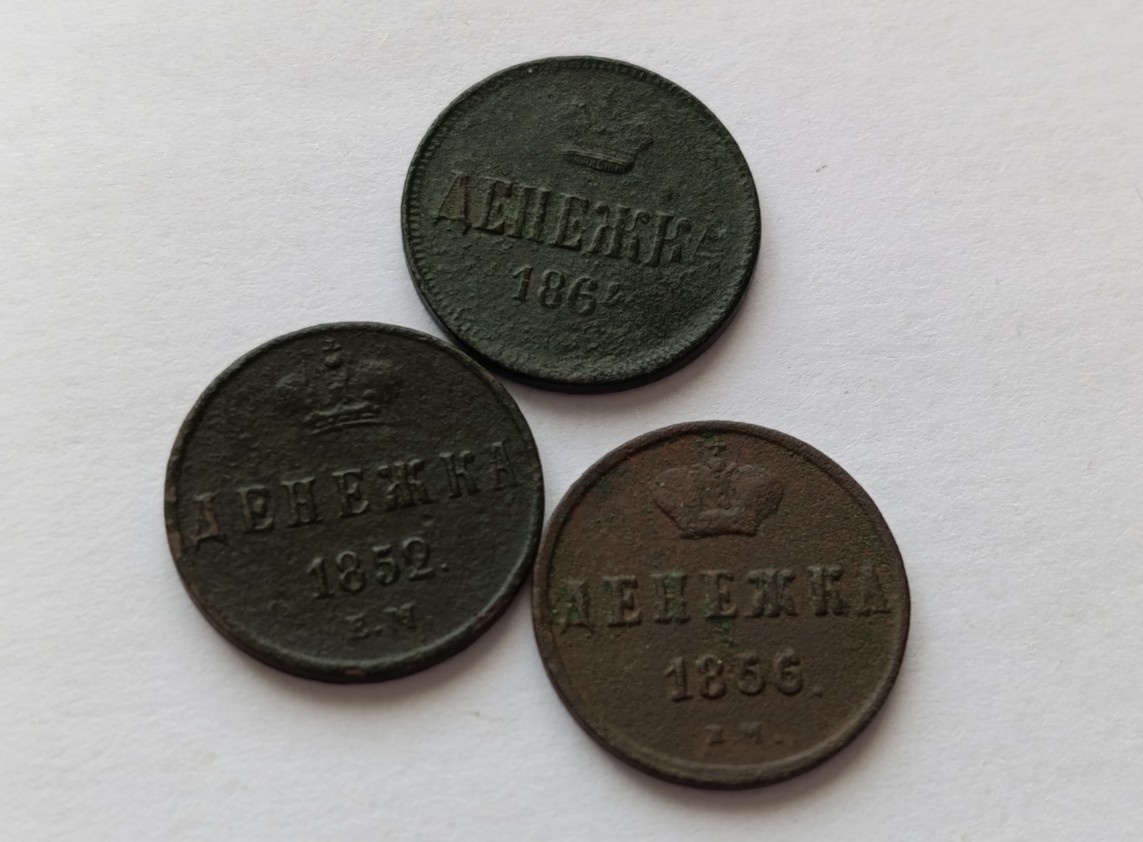 Одна денежка в год. Вот такая моя статистика. А здесь на фото изображены всего три денежки, которые находятся в моем альбоме: На самом деле денежек у меня более десятка штук (немного более), но все они имеют недостаточное состояние, чтобы быть помещенными в альбом. Часть - утёрта до неприличия, часть - гнилые, часть - совмещает оба эпитета. Монеты с красивым номиналом "денежка" чеканились в нашей стране в период с 1849 по 1867 годы. Всё, что отчеканено по 1855 год включительно, имеет вензель императора Николая I. С 1855 года монеты чеканились с вензелем сына его Александра II. С годом 1855 существует оба варианта денежек, но с вензелем НI монеты 1855 года встречаются чуть реже. Тиражи медных монет номиналом "денежка" нельзя назвать большими, но и "в среднем" тиражи нельзя назвать маленькими. Всё зависит от года. Вот, к примеру, здесь на фото представлены 3 года: 1852 год - тираж 14,7 миллионов штук 1856 год - тираж 6 миллионов штук 1864 год - тираж 0,5 миллиона штук. Данные о тир