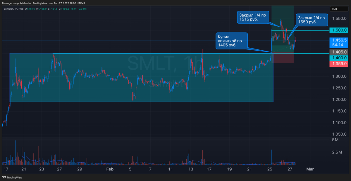 Трейдинг — это не только прибыльные сделки, но и потери, ошибки и постоянное обучение. В этом разборе я поделюсь тремя сделками: одна принесла хороший доход, другая закончилась убытком, а третья показала, почему важно следовать стратегии. Сделки – Самолёт: идеальный вход лимитной заявкой на пробое длительной консолидации по 1 405 руб. Закрыл 1/4 позиции по 1 515 руб. Ожидал, что после долгого боковика цена быстро уйдёт в диапазон 1 600–1 800 руб. Максимум дня составил 1 550 руб. (+10,32% от точки входа). Весь день наблюдал за позицией – акции выглядели сильнее рынка. Основная сессия закрылась в хорошем плюсе, но после публикации данных по инфляции котировки ушли вниз. Нужно было закрывать руками на пробое 1 500 руб. сверху вниз, но закрыл 3/4 по 1 455 руб. Итог: +57 777,8 руб. – Норильский никель: покупка перед недельными данными по инфляции на ретесте уровня 139–140 руб. В итоге закрыл позицию с убытком на аукционе по 138,3 руб. Ошибка – нужно было дождаться уверенного пробоя 140 руб.
