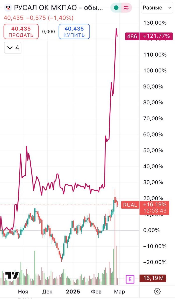 И как мы можем наблюдать, очередная политическая словесная история, моментально двинула рынок вниз…. На мой взгляд, на ближайшем промежутке времени, сейчас только точечные истории могут дать какой то результат 💪 Обратил внимание, что на этих всех заявлениях, предложениях по редко земельным металлам и тд, акции Русала в Гонконге дают иксы, в то время как у нас это история как будто бы не отыграна 🤷♂️ не достаточно капитала для движения, в то время как в Гонконге иностранный инвестор пытается отыграть историю с урегулированием и партнерством… Думаем 💭 *не является ИИР