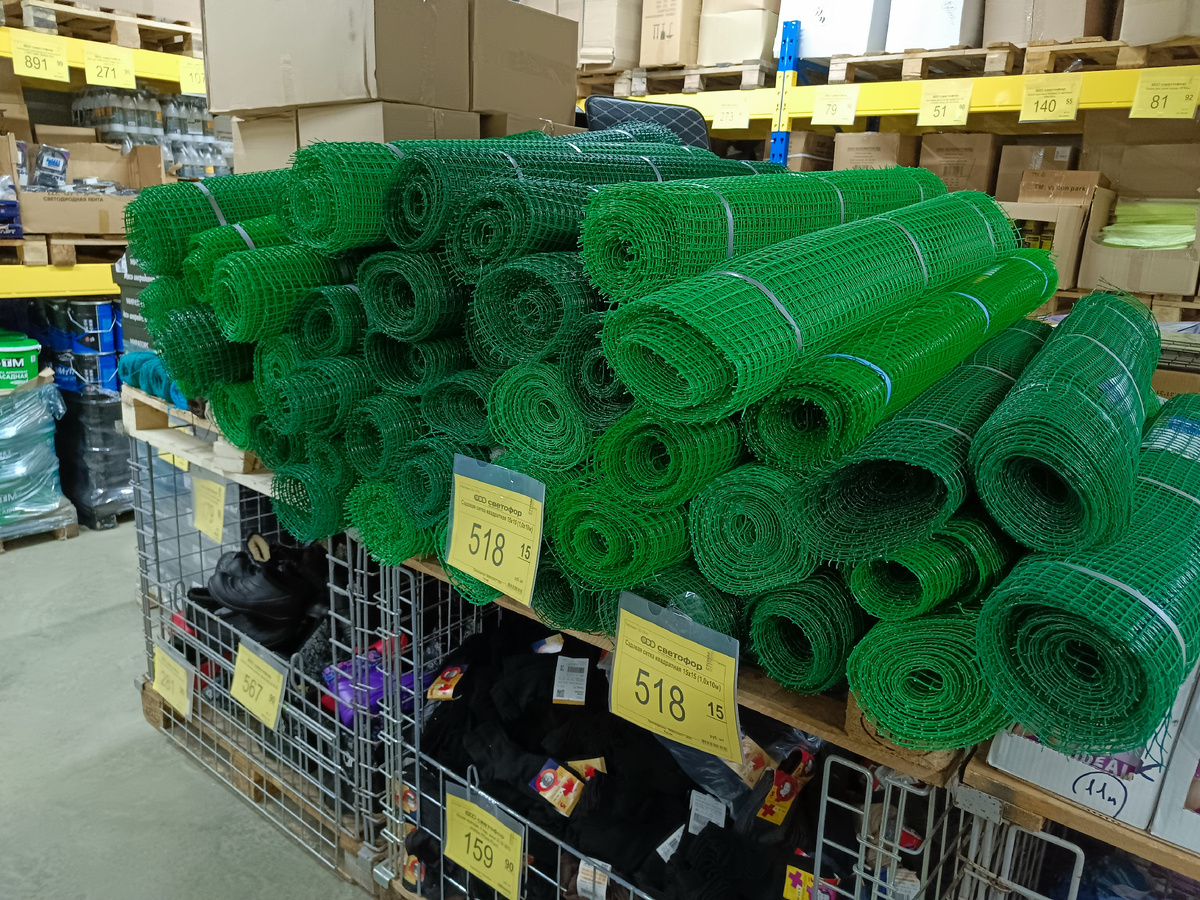 Садовая пластиковая сетка для ограждения с сечением 15х15 мм, шириной 1 метр, в рулоне 10 метров. Цена 518 рублей.
