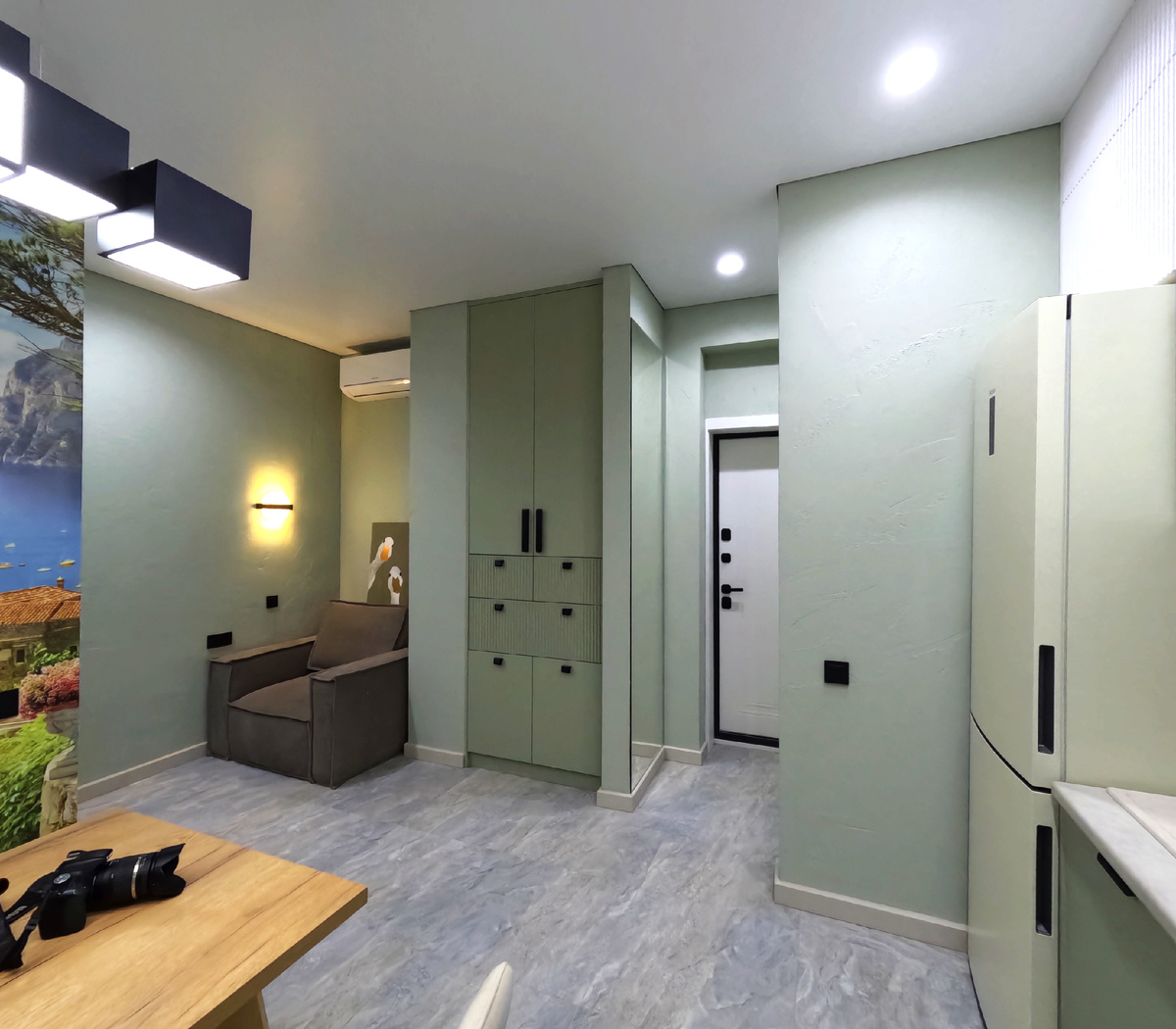 Всем доброго дня. Была сегодня на реализованном объекте и сделала несколько фото интерьера. Квартира не большая, 30 м кв, предусмотрена под сдачу в аренду. Но на этой маленькой площади уместилось все необходимое для комфортного проживания. Кухня, со всей необходимой техникой, стол на 4 персоны, спальная комната на 2 человек, много хранения в виде шкафов, санузел с душем и местом для сушки вещей. начнем со водной группы, это небольшая зона, которая включает в себя зеркало в пол и вместительный шкаф. Сразу переходит в кухню-столовую. Здесь мы видим еще один шкаф с ящиками, доп спальное место в виде кресла, которое раскладывается, и столовую группу на 4х человек. По отделке, на полу керамогранит+подогрев полов, стены- декоративное покрытие, потолок - натяжной с теневым профилем. на стене в виде акцента исполнена фреска. Кухонный гарнитур выполнен из мдф фасадов в пленке. На фартуке смонтирован крупноформатный керамогранит. Дополнительное спальное место - кресло кровать. постирочная зона.