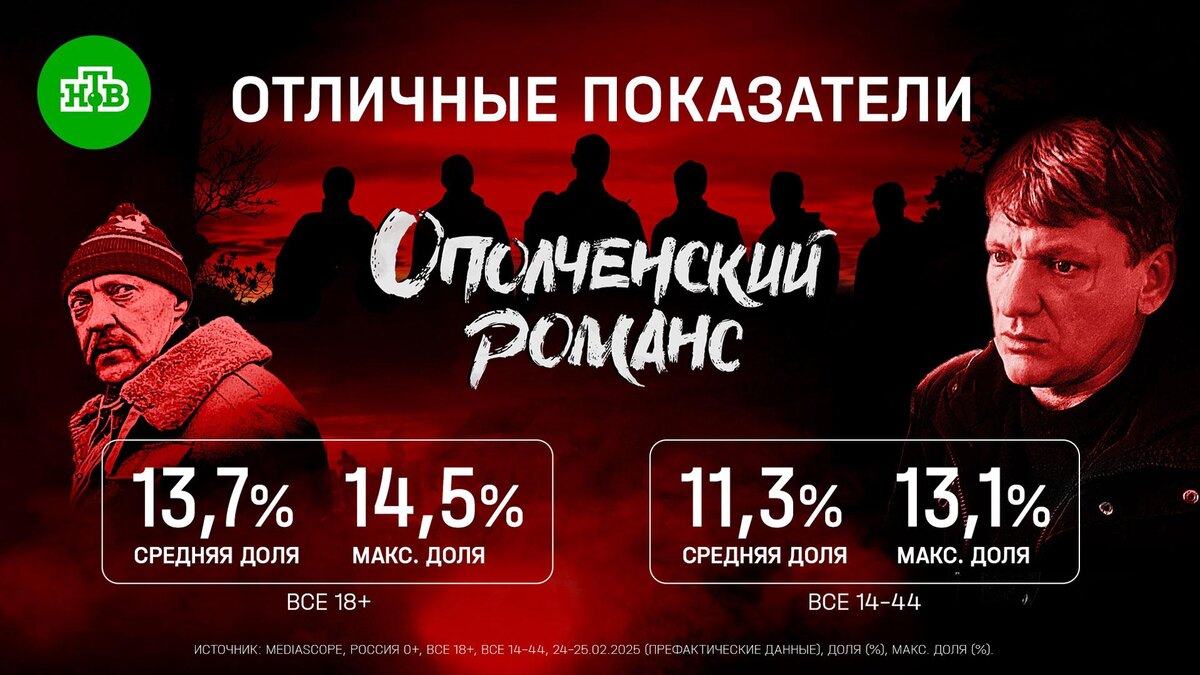 24 февраля в эфире телеканала НТВ состоялась премьера драматического сериала «Ополченский романс», снятого по мотивам одноимённого сборника рассказов Захара Прилепина. В первые дни показа сериал прошел со средней долей 13,7% среди зрителей всей России старше 18 лет. Максимальная доля в аналогичной аудитории достигла 14,5%. В молодой аудитории 14–44 сериал также продемонстрировал отличные показатели: средняя доля показа составила 11,3%, максимальная — 13,1%. Восьмисерийная драма «Ополченский романс» погружает зрителей в события осени 2014 года через призму личных историй и сложных моральных выборов героев. Сериал выходит на НТВ по будням в 22:10, сегодня зрители НТВ увидят две финальные серии.