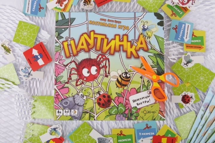 Много ли вы знаете игр, в которых можно порезать саму игру? «Паутинка» - это очень необычная игра для самых маленьких настольщиков. В ней нужно резать игру! Конечно, не из озорства, а с благородной целью – освободить букашек, запутавшихся в паутинке. Ох уж эти букашки! Вечно они попадают в разные истории. Вот и сейчас они так весело играли на полянке, что запутались в липкой паутинке. Помогите всем букашкам освободиться из паутинки. Постарайтесь, чтобы паучок не упал на траву. Действуйте осторожно, ведь паутинка очень неустойчивая! Из коробки с игрой собирается зелёная полянка с настоящей паутинкой, на которой размещаются фигурки паучка и разных букашек. Игроки по очереди делают разрезы на паутинке, стараясь освободить букашек и не потревожить паучка. Проигравших в этой игре нет – все действуют в одной команде! В игру входят все необходимые компоненты: полянка со специальными прорезями, травинки для крепления паутинки, много-много паутинок, ножницы, карточки с заданиями и, конечно, фиг