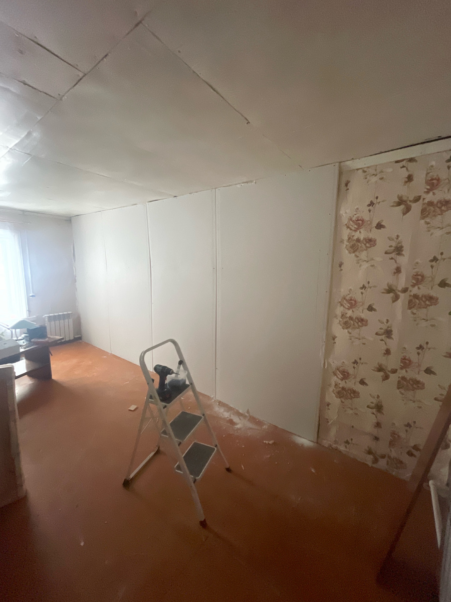 На следующий день после возведения перегородки, Игорь перешел к обшивке стен в большой комнате. Оторвал плинтуса, отвернул кабель каналы, снял крепления с батарей. После процесса подготовки - приступил к монтажу гипсокартона. Стены были достаточно ровные, но с небольшими провалами в середине, поэтому решили обшивать без направляющих профилей, выравнивая стены за счет регулирования притяжения гипрока к стенам комнаты. Огромную помощь в создании ровных стен, ему предоставила мама. На себя она взяла роль художника и филигранно делала вырезы на листах под окна, трубы, подоконники и уменьшала листы по размеру(высота/ширина). В течении дня, они полностью сделали стены. Пришла с работы я уже в светлую комнату с ровными стенами. Даже не смотря на то, что обои там были не темные , комната заиграла новыми красками. Мне оставалось только навести порядок и отмыть полы от гипса. На следующий день, мы запаслись гипсовой шпаклевкой и потихоньку начали шпаклевать швы. После работ с гипсокартоно