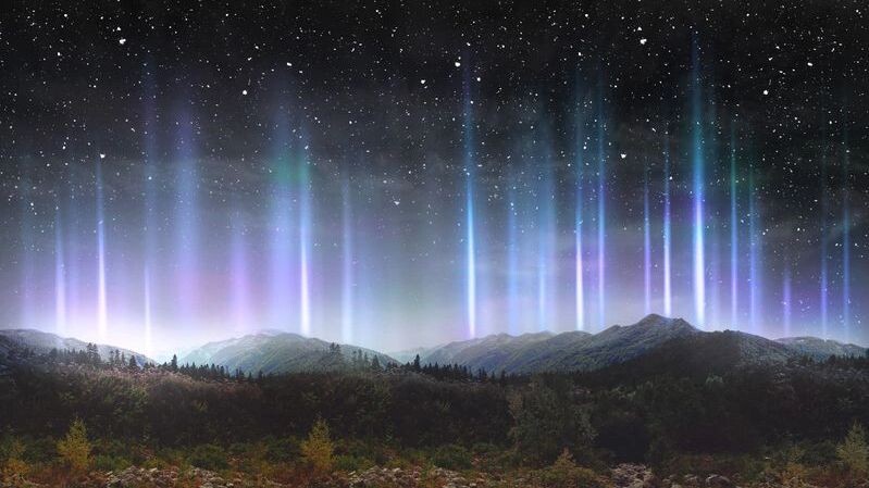 В ночное время ледяные кристаллы способствуют образованию красивых светящихся столбов, идущих от фонарей вверх в небо.