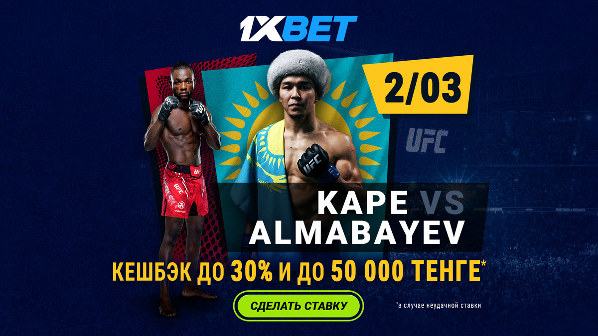Манел Капе – Асу Алмабаев Любите смешанные единоборства? Ударная акция для всех поклонников боев MMA! Каждая ваша ставка на поединки в UFC будет защищена! Компания 1XBET предлагает поддержать своего фаворита и получить до 50 000 тенге и кэшбэк до 30% в случае проигрыша. Чтобы участвовать в акции «1x Punch» необходимо зарегистрироваться на сайте компании и сделать одиночную ставку на маркет «П1 Х П2» по линии/ Live на сумму от 5000 KZT на бой, представленный на сайте 1XBET или в приложении. Учитывается только первая ставка на бой. Если ставка одиночная и она проиграет – вы получите бонус, соответствующий проценту ( согласно градации) от первоначальной ставки. Если ваша первая ставка на этот бой выиграет, бонус в таком случае не зачислиться. Максимальная сумма возврата 50 000 тенге. Делайте ставки на бой и болейте за своих фаворитов вместе с главным спонсором спортивных эмоций 1XBET!