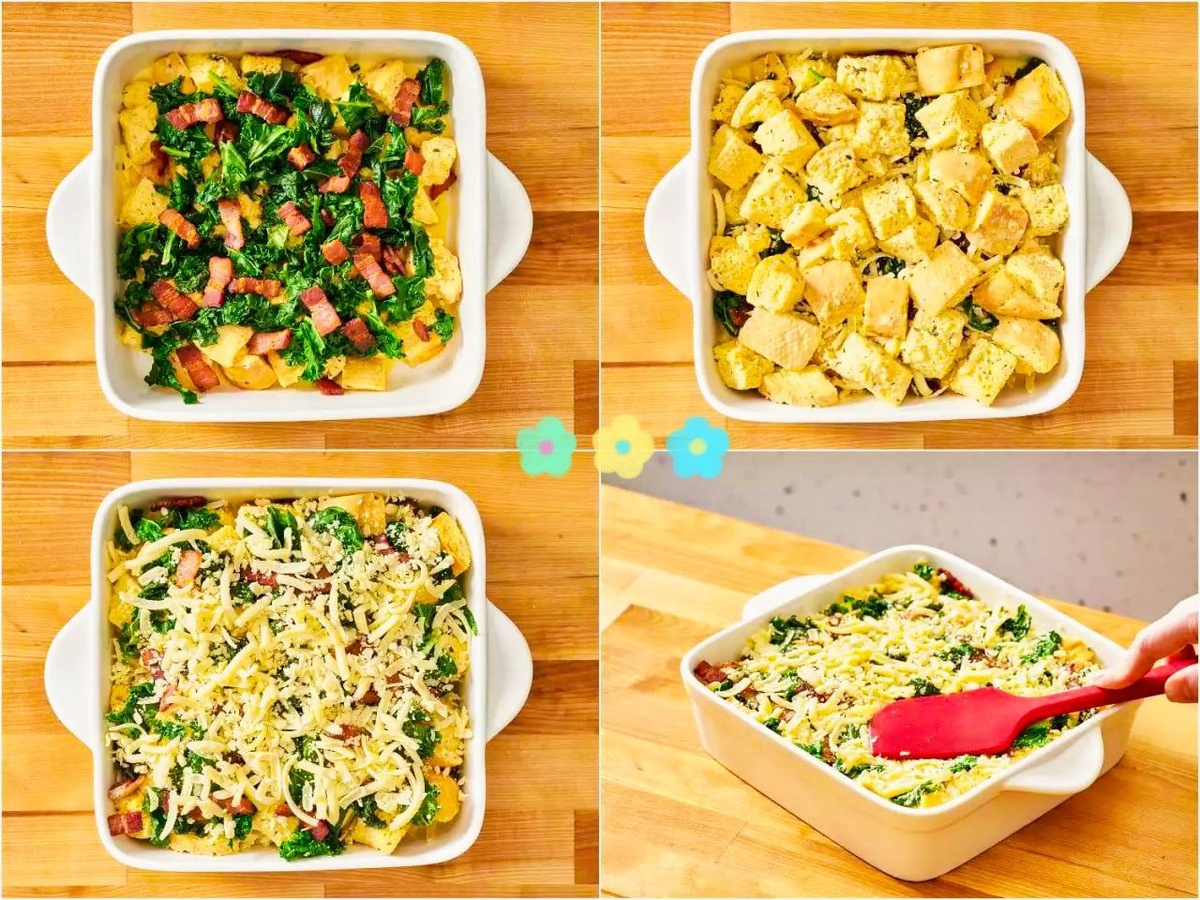 Это сытное блюдо, которое можно приготовить заранее и которым можно наслаждаться в любое время дня, по вкусу напоминает пикантный хлебный пудинг. Всю работу можно сделать накануне вечером, и тогда всё, что вам останется, - это поставить блюдо в духовку, когда вы проснетесь. Идеальные пропорции для этого блюда - 2 части хлеба, 3 части яиц, 4 части молочных продуктов, 2 части добавок и 1 часть сыра. Для 4-6 порций вам потребуется. 226 грамм белого хлеба, нарезанного кубиками толщиной 2 см 115 г бекона, нарезанного тонкими полосками 115 грамм кудрявой капусты, очищенной от плодоножек и крупно нарезанной (можно заменить на шпинат, савойскую капусту, брокколи) Соль 6 крупных яиц 1 стакан (240 мл) цельного молока 1 стакан (240 мл) жирных сливок 1,5 чайной ложки дижонской горчицы 1 чайная ложка свежего тимьяна, мелко нарезанного 1/8 чайной ложки свежемолотого черного перца 1/8 чайной ложки тертого мускатного ореха Размягченное несоленое сливочное масло для смазывания формы дл