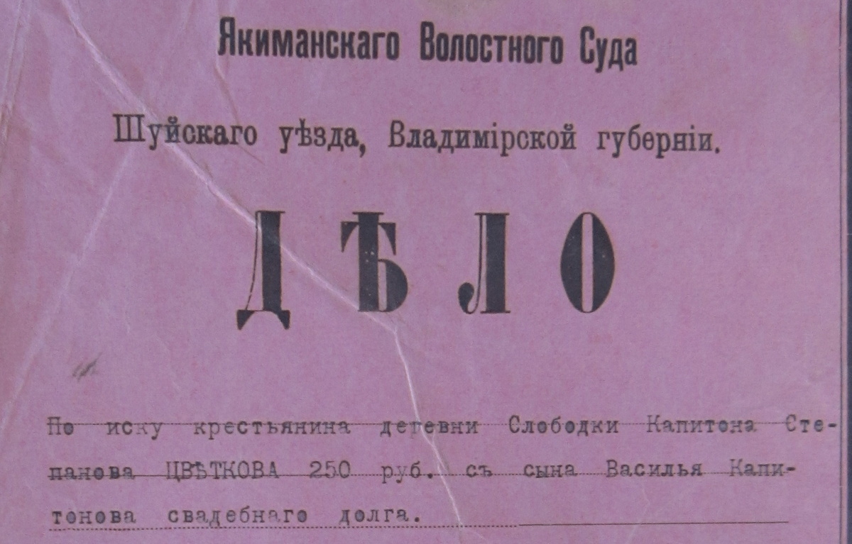 1 января 1914 г. крестьянин д. Слободки Якиманской волости К.С. Цветков жаловался на своего сына Василия Капитоновича, на свадьбу которого истратил 250 руб. В числе заимодавцев Цветков называл 6 лиц, у которых он занял от 10 до 60 руб. Сын же покинул семью, не заплатив эти деньги. Впрочем, стороны помирились и к разбору дела в суд 23 февраля не явились.