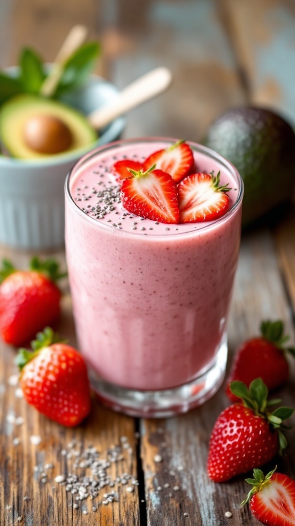 Если положить рядом несколько свежих ягод клубники и авокадо, свежесть ингредиентов станет еще заметнее, гарантируя, что этот смузи будет таким же питательным, как и на вид.