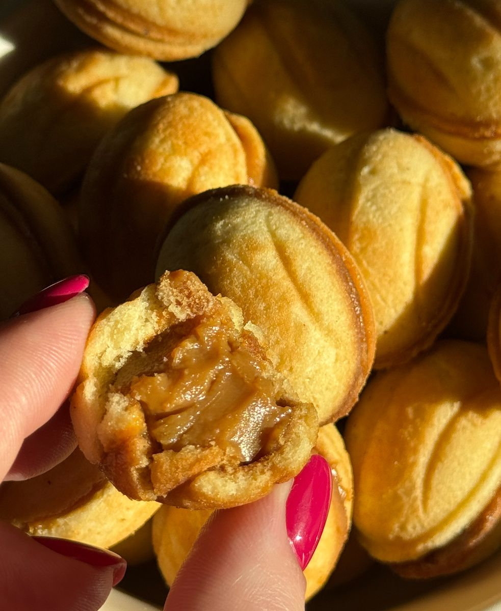 Разогреваем орешницу и чайной ложкой или кондитерским мешком выкладываем небольшое количество теста в форму, в каждую ячейку.