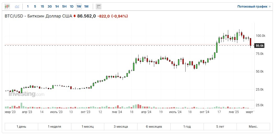 Риторика Дональда Трампа какое-то время положительно влияла лишь на российский фондовый рынок, что тоже являлось лишь психологической реакцией инвесторов, фундаментально то в российской экономике ничего не изменилось. На своем, американском рынке Трамп, наоборот, рост остановил, и, как я предполагаю, далее последует в лучшем случае затяжной боковик, в худшем - снижение, это описал отдельно (кстати, с того момента рынок США уже заметно снизился). И вот в последние дни посыпался и рынок криптовалют, который до этого поднялся как раз на победе Трампа. Три месяца курс биткоина держался в районе 100 тыс. долларов и выше, доходил до 109 тыс, а теперь начал резко опускаться обратно, сейчас уже вернулся на уровень середины ноября 86,5 тыс., когда и начался его рост после американских выборов. Альткоины теряют в цене намного больше, многие в последние дни теряли 10-20% стоимости и более ежедневно, что в общем не редкость для крипторынка. Например, вторая по значимости криптовалюта эфириум откат