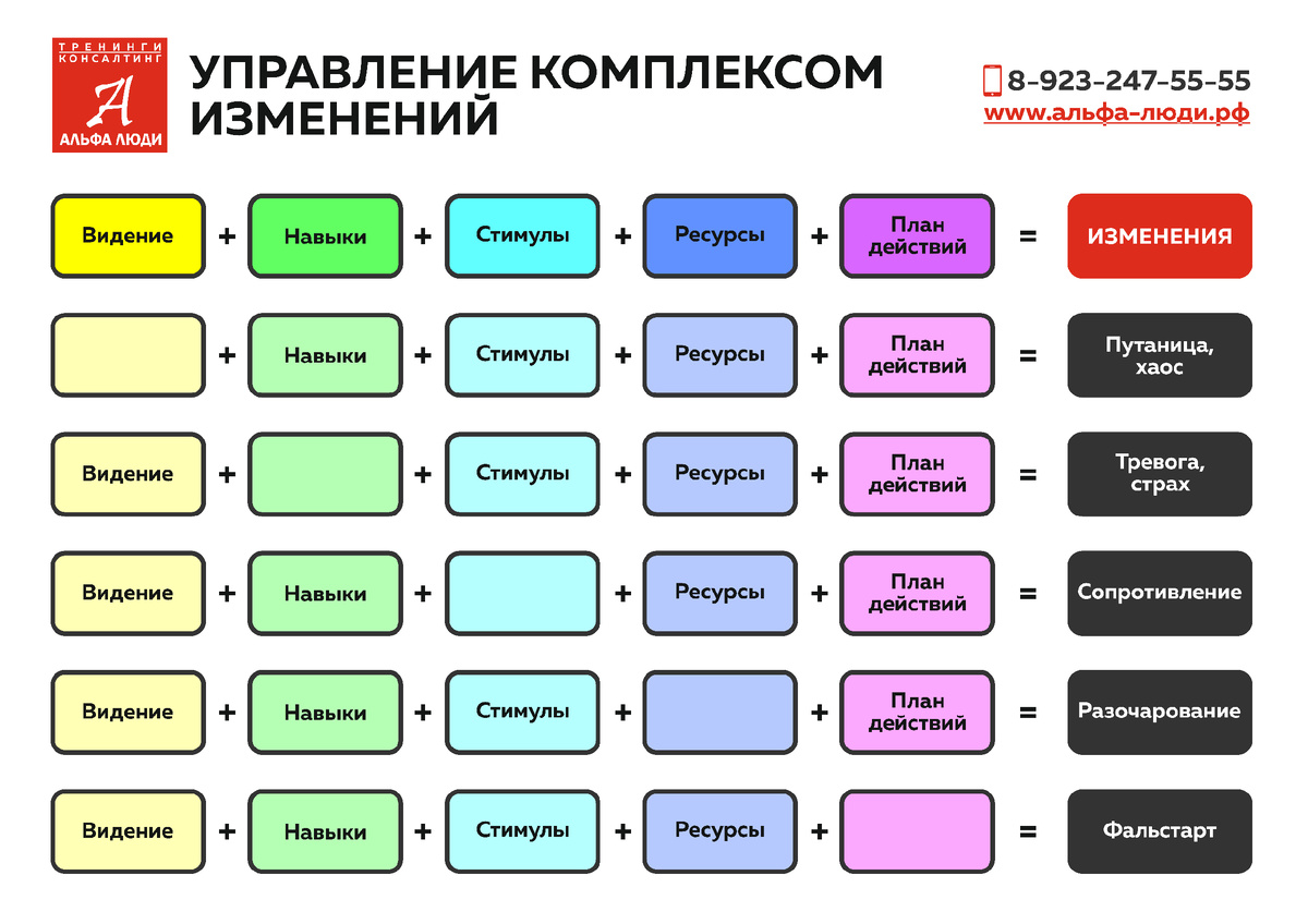 В мире бизнеса изменения неизбежны, и их успешное внедрение требует системного подхода. Посмотрите структурированные формулы, которые помогут вам понять, как различные элементы — видение, навыки, стимулы и ресурсы — влияют на ваш путь к успеху. Воспользуйтесь ими, чтобы избежать путаницы, тревоги или разочарования. Формула изменений: Видение + Навыки + Стимулы + Ресурсы + План действий = Изменения - (Видение)+ Навыки + Стимулы + Ресурсы + План действий = Путаница, хаос Видение - (Навыки) + Стимулы + План действий = Тревога, страх Видение + Навыки - ( Стимулы) + Ресурсы + План действий = Сопротивление Видение + Навыки + Стимулы - ( Ресурсы)+ План действий = Разочарование Видение + Навыки + Стимулы + Ресурсы - (План действий )= Фальстарт Эти формулы подчеркивают, как различные элементы, такие как видение, навыки, стимулы, ресурсы и планы действий, влияют на успешность изменений и их возможные негативные последствия.