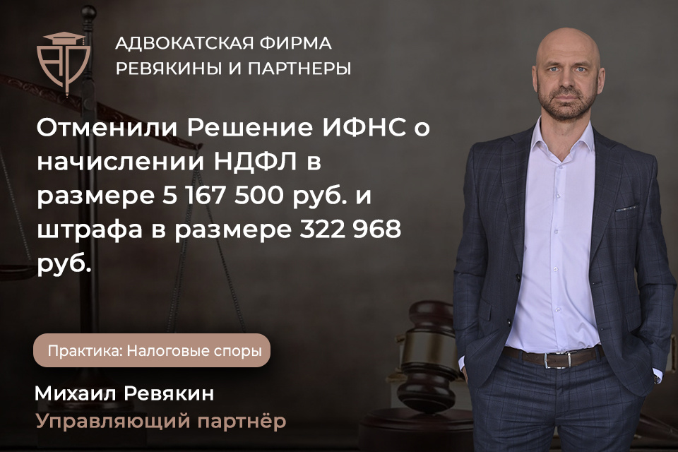 Отменили Решение ИФНС о начислении НДФЛ в размере 5 167 500 руб. и штрафа в размере 322 968 руб.