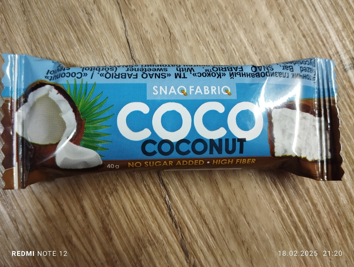 Пробуем Кокосовый батончик Snaq Fabriq в шоколаде "COCO" со вкусом "Кокос", по вкусной цене в Чижике за 49 руб. кокос; водорастворимые волокна кукурузы; инулин (пищевые волокна); олигофруктоза (пищевые волокна); молочный шоколад (водорастворимые волокна кукурузы; масло какао; какао тёртое; молоко сухое обезжиренное; эмульгатор (соевый лецитин); ароматизаторы натуральные; подсластитель (стевиолгликозиды)); вода; агент влагоудерживающий (глицерин); подсластитель (сорбит); соль; ароматизаторы натуральные,; регулятор кислотности (лимонная кислота); антиокислитель (аскорбиновая кислота); консервант (сорбат калия); подсластитель (стевиолгликозиды) Изготовитель: ООО "Фитнес Фуд" г. Тольяти. Срок годности: 12 месяцев. Вес батончика соответствует заявленному 40 гр.! Батончик запакован хорошо, Информация о продукте содержится на упаковке, немного мелковато, но прочитать возможно. Батончик хорошо режется, Шоколад вкусный молочный. Батончик нежный, кокосовый. Напоминает "Баунти", но без сахара, не