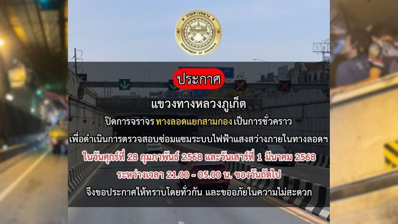 Тоннель, расположенный на Пхукете возле супермаркета Lotus’s Extra на Bypass Rd., известный как Samkong Underpass, будет закрыт для автомобильного движения в ночь с 28 февраля на 1 марта.