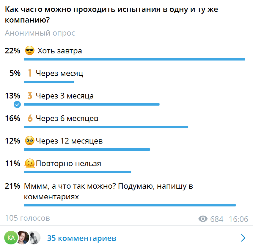 ✅ Мы с вами обсудили испытание на прочность, ведь зачастую люди, которых я встречаю на своем пути, находятся в разном состоянии при поиске работы. Кто-то полон драйва и энергии, чтобы достичь цели. А кому-то кажется что ситуация, в которой пришлось искать работу никак не новый вызов, а полный провал и надо из него как-то выбираться. От отношения и зависит результат. ✅ Мы узнали историю моей читательницы и вместе посоветовали ей не держаться за работу, которая приносит только депрессию и отторжение. Стоит ли терпеть - основной вопрос. Мы однозначно поняли, что нет, не стоит. ✅ Мы поговорили о том, что плохо - это хорошо. И хотя неудачи нас ломают, нужно научиться получать пользу от негативного опыта, помочь себе самому и изменить свое отношение к происходящему в свою пользу. ✅ Мы с вами познакомились с моей личной историей в которой казалось, что результат не достижим, однако я своим примером доказала, что невозможное возможно. Мы поучаствовали в опросе о том, как часто можно проходит