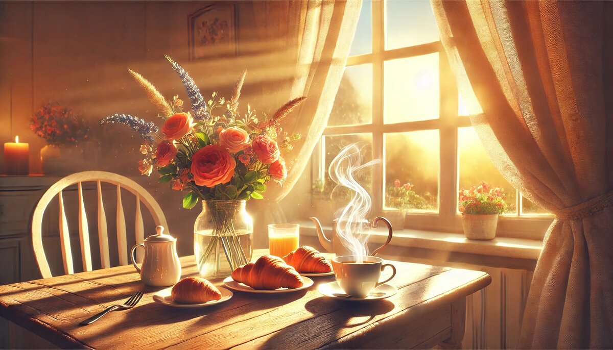 Утро — это маленькое чудо, когда солнце пробуждает мир, капли росы мерцают на листьях, а аромат свежего кофе наполняет дом уютом. Пусть это утро принесёт вам новые мечты, вдохновение и тёплые улыбки!