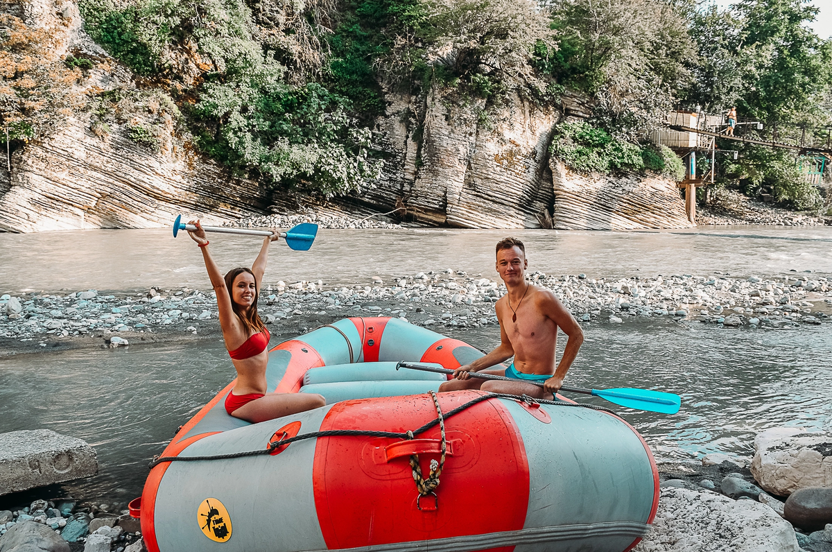 Идея #1 Отправиться на рафтинг по горной реке Мзымта с завершением в баньке, и приправить это шашлычком.