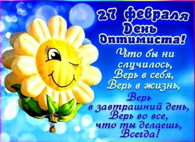 27 февраля — Международный день оптимиста! В этот замечательный праздник мы решили поделиться с вами практичными рекомендациями и рассказать про 10 способов сохранения оптимизма в современной жизни. 1️⃣ Будьте разборчивы с информацией и не верьте всему, что пишут в интернете Сколько информации обрушивается на нас каждый день, и большая ее часть – не более чем "инфошум", чье-то субъективное мнение или ничем не подтвержденные слухи. Читая очередной репост новости в социальной сети или очередную «сенсационную» статью, помните, что главная цель интернет-СМИ – это ваш «клик» по ссылке, поэтому заголовки буквально кричат, чтобы вы обратили на них внимание. 2️⃣ Постарайтесь поменьше переживать о будущем Проще сказать, чем сделать, но все же постарайтесь поменьше переживать о том, что ждет нас в будущем. Ведь оно еще не наступило, и, получается, вы переживаете о том, чего нет и скорее всего никогда не будет. Никто не знает, что там, в завтрашнем дне. Единственное, что подвластно нашему конт