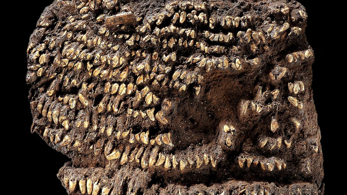 Археологи нашли её в Германии, недалеко от Лейпцига, про обследовании участка, где предполагалось создать открытый угольный карьер. Дело было в 2015 году. В ходе раскопок нашли поселения каменного и бронзового веков, в том числе более 300 захоронений, сотни орудий из камня, наконечников копий, керамических сосудов, костяных пуговиц, изделий из янтаря. Неподалёку раскпопали могилу женщины, погребенной вместе с полкило золотых украшений. Но стильная сумочка каменного века — это что-то особенное. Обнаружена она в погребении, датируемом 2500–2200 гг. до нашей эры. По словам археолога Сюзанны Фридерих, зубы, скорее всего, служили украшением для внешнего клапана сумочки. «С течением лет кожа или ткань исчезли, и все, что осталось, — это зубы. Они все ориентированы в одном направлении, и это очень похоже на современную дамскую сумку», — говорит учёная. Специалисты отмечают, что зубы собак — частая находка в захоронениях каменного века Северной и Центральной Европы. Это значит, что собак испол