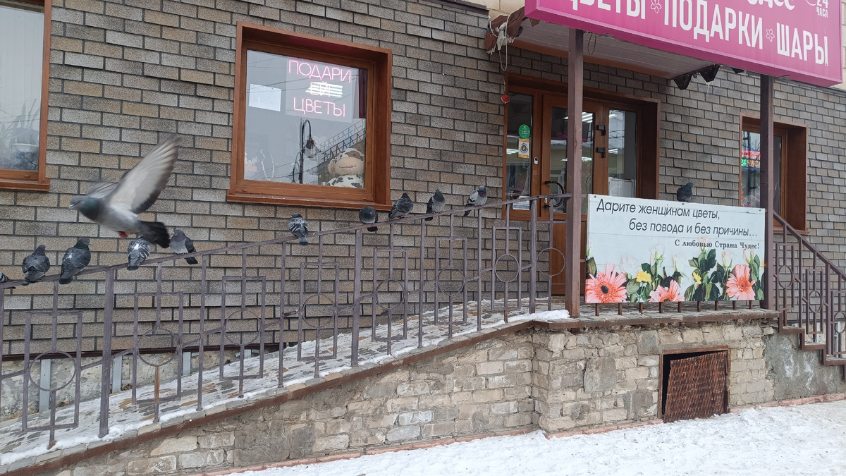 Пока шла на работу, у магазина цветов куча голубей, наверное, кто-то сверху подкармливает.