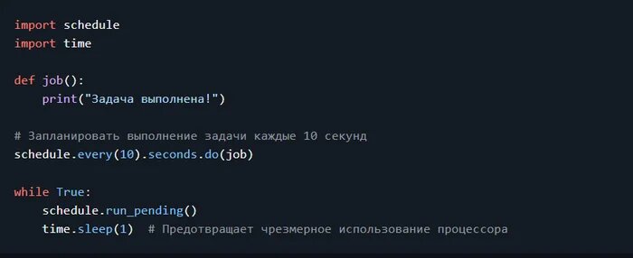 которая позволяет установить, как часто должна выполняться определенная функция (например, каждый час, день, неделю) pip install schedule Чтобы запланировать задачу, необходимо определить функцию и использовать schedule.every(), чтобы назначить интервал выполнения. Пример: запуск задачи каждые 10 секунд Этот скрипт выполняет job() каждые 10 секунд. Цикл while постоянно проверяет наличие запланированных задач и выполняет их в нужное время. Вы можете запланировать выполнение задач в заданное время, используя .at() и другие параметры интервала: Вы можете запланировать несколько задач, определив отдельные функции и назначив им разные интервалы. Чтобы удалить задачу, используйте schedule.clear(). Вы можете удалить все задачи или указать конкретную, используя теги. Для приложений с графическим интерфейсом или постоянным фоновым выполнением можно запустить планировщик в отдельном пото
