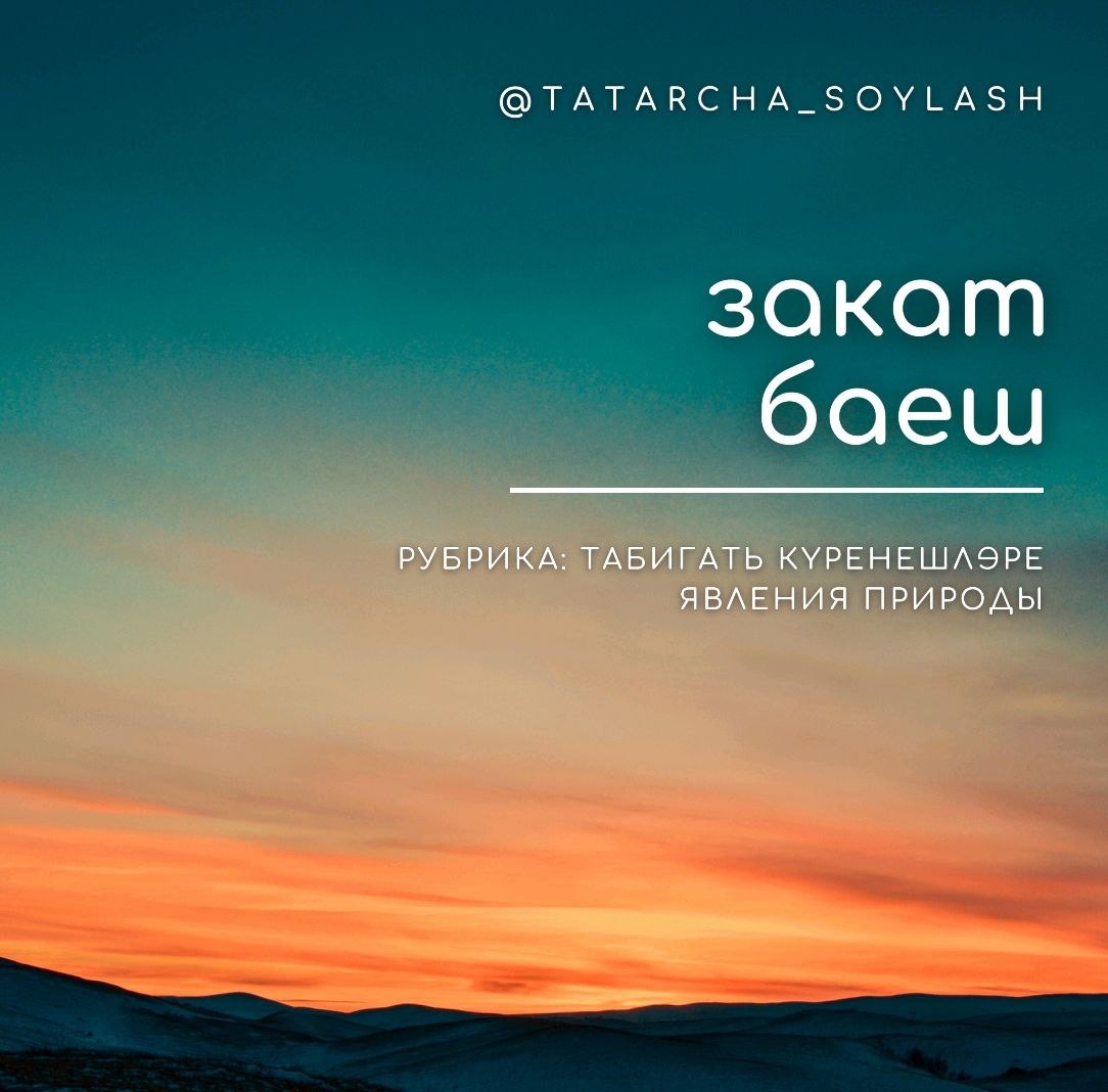 Закат можно перевести 4 способами, первый из них — «баеш», это классический вариант мисал: кояш баешы — заход солнца баешка юнәлергә(-ү) — направиться к заходу Теперь, мы можем сказать: 1. кояш баеды / батты — солнце солнце зашло 2. кояш баюы / батуы — заход солнца Также, можно использовать вместе с этим словом глаголы «баю» и «бату» мисал: шәфәкъ баеды (или же байый) / батты (бата) #Природа