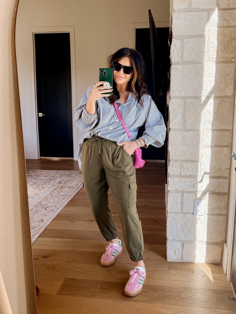 И ещё вариант - джоггеры + белая рубашка. Отыщите данные штаны тёмных оттенков, чтобы они отлично гармонировали со светлой рубашкой. Вместо белой, вы можете выбрать любой другой светлый цвет, например: молочный, светло-розовый или бежевый. Таким образом у вас получится наряд в двух стилях: спорт и классика. Также дополните его стильными лоферами, в которых вам также будет удобно. Ну и конечно же к такому луку вам точно стоит добавить красивые украшения и аксессуары. В итоге получится очень женственный и при этом кэжуал образ.