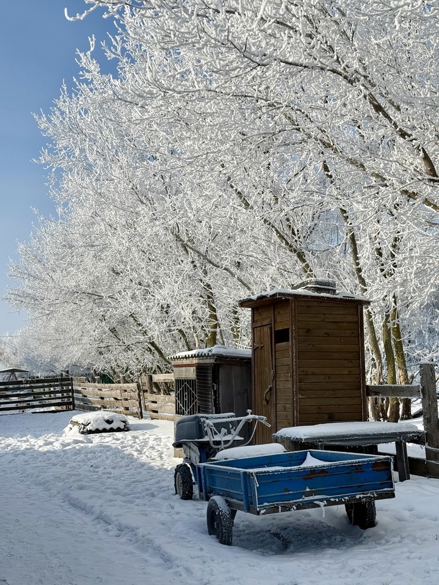 Собрав все необходимые вещи, я отправилась с коляской на хозяйство. По дороге ветер свистел, и я чувствовала, как мороз щиплет щеки.