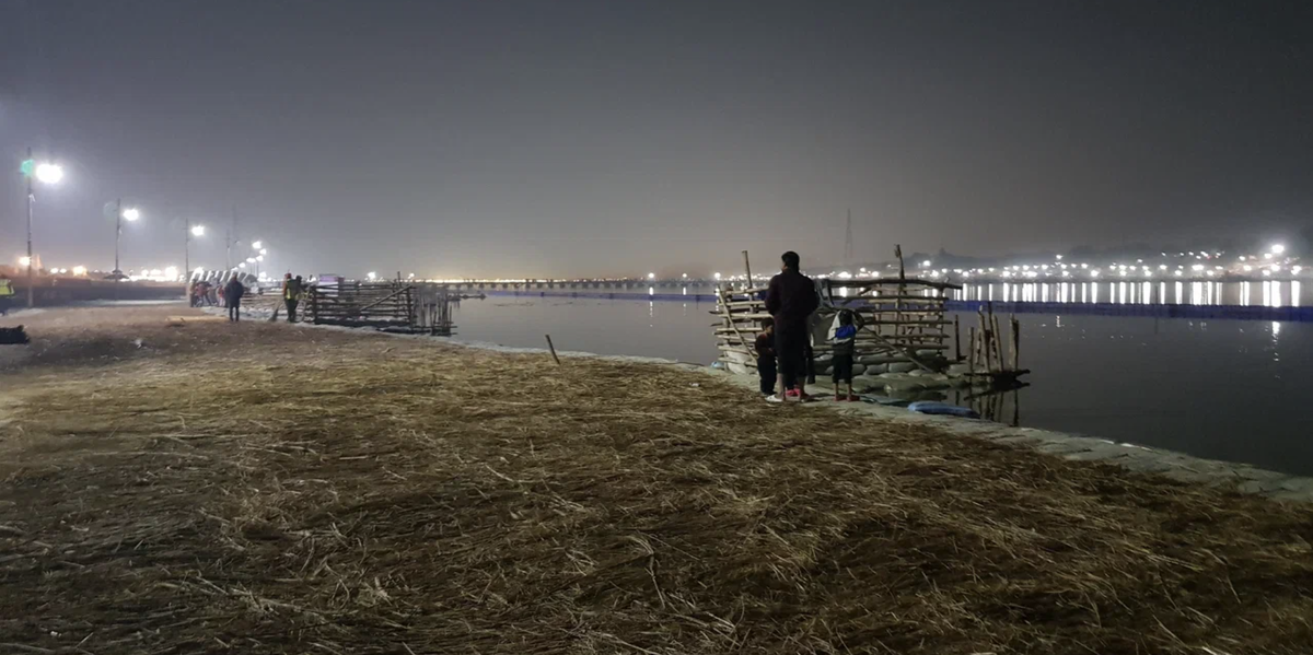 После напряженного дня, перелета, долгой дороги к месту ночевки, размещения в шатре, мы решили погулять по лагерю. Мы - это три русские женщины-паломницы, я и наш общий гид Хариндра. Сначала мы пошли на берег Ганга. Несмотря на поздний час, там было много людей, которые приносили дары великой реке: Я потрогала воду - она была холодной, да и температура воздуха стремительно падала - сказывался континентальный климат, от 25 градусов тепла днем, до +5 ночью. Пляж был просто огромным, песок уже остыл. С другой стороны светился огнями наш лагерь. Наш лагерь очень прилично выглядел в свете фонарей: Мы пошли по дороге, по которой бесконечным потоком шли паломники - с детьми, вещами, песнопениями: Лагеря паломников разного уровня растянулись вдоль великого Ганга. Мы нашли лагерь для ВИПов и заглянули в него: Хариндра объяснил нам, что в каждом лагере живут последователь своего гуру, за которым они следуют. Во многих лагерях в больших шатрах собирались люди, и там происходили разные заним