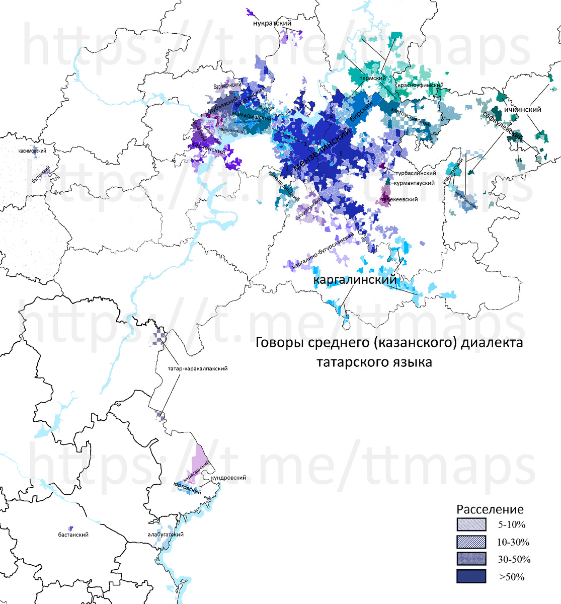 Общая же карта говоров среднего и западного диалектов татарского языка будет выглядеть так: