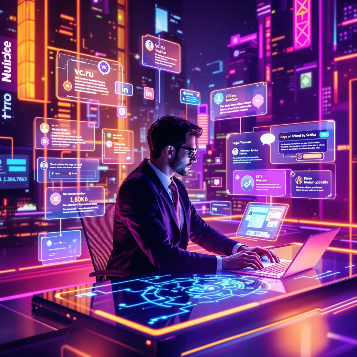 Я активно использую vc.ru, TenChat, ВКонтакте, Telegram, LinkedIn, Сетку и Дзен для продвижения. Каждую неделю в выходные я сажусь и пишу посты на неделю вперёд — это мой ритуал. В будни соцсети оживают от моих публикаций, а в выходные отдыхают, но я — нет, потому что готовлю новый контент.