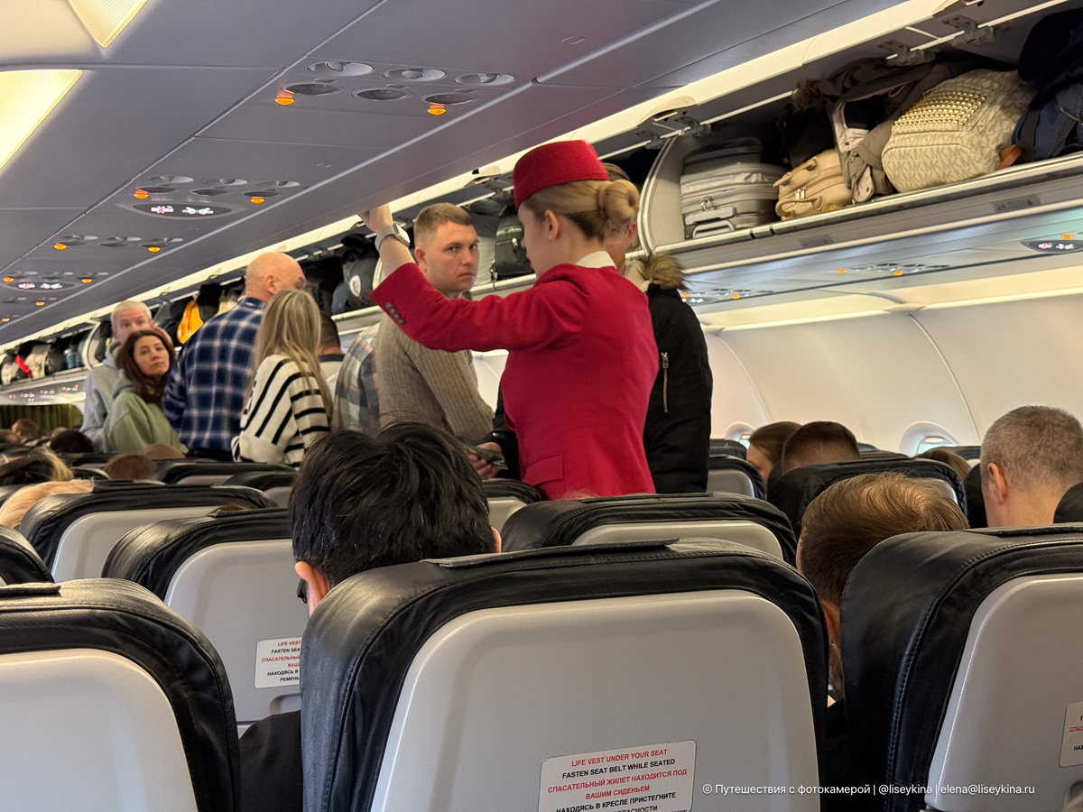 Да, такова особенность зимних рейсов. Ведь у всех пассажиров есть зимняя одежда и все стремятся её положить на полки. Кстати, забегая вперёд, скажу, что на обратном рейсе моя куртка уже не влезла на верхнюю полку, но я прекрасно подложила себе её под плечо и летела достаточно комфортно.