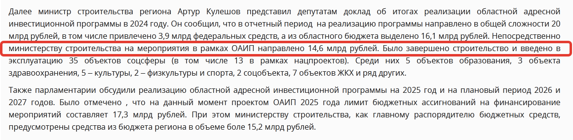 Чиновник сказал, что на мероприятия в рамках ОАИП в минувшем году было направлено 14,6 млрд рублей. Никто из «народных избранников», пришедших на заседание думского комитета по строительной политике, не поинтересовался у министра: а где еще деньги? Где 15 млрд рублей? Вы же обещали больше? скриншот из пресс-релиза на сайте областной думы, 19.02.2025 г., отчет о встрече депутатов с министром Кулешовым Дело в том, что на последней встрече в таком формате, которая состоялась в парламентском центре 31 октября, министр Кулешов называл тем же депутатам (из комитета по строительству) совсем другие цифры расходов на ОАИП по итогам 2024 года. В пресс-релизе облдумы на сей счет было написано, что «непосредственно же региональному минстрою предусмотрено 29,5 млрд рублей, в том числе 26,8 млрд из бюджета региона». скриншот из пресс-релиза облдумы, с заседание комитета по строительству, 31.10.2024 г., министр Кулешов называет депутатам совсем другие цифры Согласитесь, это все это выглядит странно: