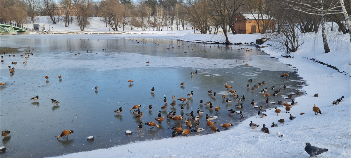 Нас без сомнения ждут приключения... Выдался свободный денёк и захотелось глотка свежего воздуха. Задумалась куда бы поехать, чтобы и недалеко, и природа, и красиво. Вспомнила о двух московских усадьбах с парками Царицыно и Коломенское. Финальный выбор пал на Царицыно, давненько там не была. Да и место для строительства было выбрано самой Екатериной II, её поразили пейзажи здешних мест. Надеюсь и меня они не оставят в очередной раз равнодушной, не смотря на февральскую погоду. И ... в путь, получать позитивные эмоции и дышать свежим воздухом. Полтора часа в транспорте, 5 минут пешком от одноимённого метро Царицыно и Центральные ворота в парк. Вход на территорию бесплатный. И чем же нас встречает усадьба? Утки. Полчища уток.)) Много-много-много огарей - красных уток. Одно из развлечений посетителей парка - их покормить. Но кричат они ужасно, особенно когда их много. )) Не насладишься тишиной. По берегам пруда ещё сохранились новогодние украшения. Конец февраля, но люди продолжают фот