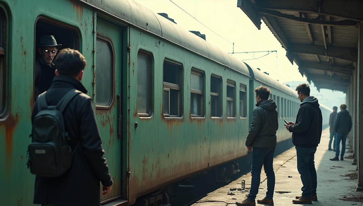 Наконец вдали зажёгся свет фар, и поезд с лязгом подкатил к платформе. Дима шагнул в вагон — пустой, если не считать старика в дальнем углу. Тот сидел неподвижно, в длинном чёрном пальто, сгорбившись над тростью. Лицо скрывала тень от широкополой шляпы.