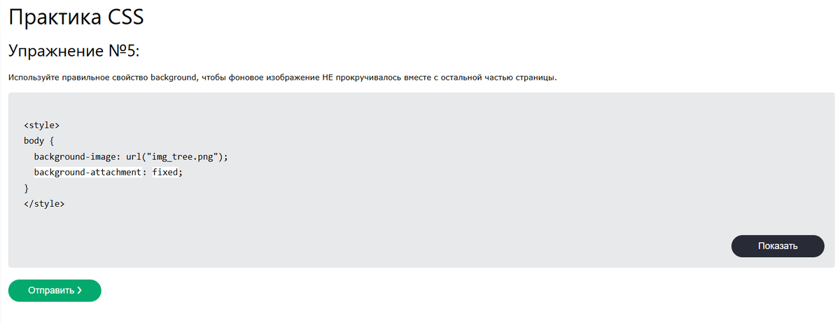 background-attachment: fixed Используйте свойство border стенографию, чтобы установить границу "4 пикселя", "пунктирную", "красную" для элементов <p>. border: 4px dotted red Используйте правильное свойство border, чтобы добавить закругленные границы к элементам <p>. border-radius Используйте свойство margin, чтобы выровнять элемент <h1> по центру. margin: auto Добавьте пробел в 25 пикселей снаружи, слева от элемента <div>. margin-left: 25px