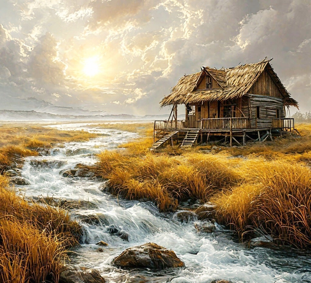 Избушка Водников стояла на берегу Порожистой Реки. Вялая, как будто высушенная под жарким взором Божественного Светила трава, скрывала сваи на которых стояла эта избушка, возвышаясь над уровнем берега. Душное марево клубилось в воздухе. Сам воздух был каким то вязким и дышать стало тяжелее. Близость воды и жар, льющийся с Небесной Тверди делали своё дело.