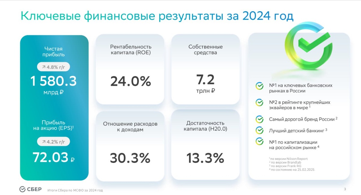 • Чистая прибыль выросла до 1 580 млрд руб. (+4,8%).