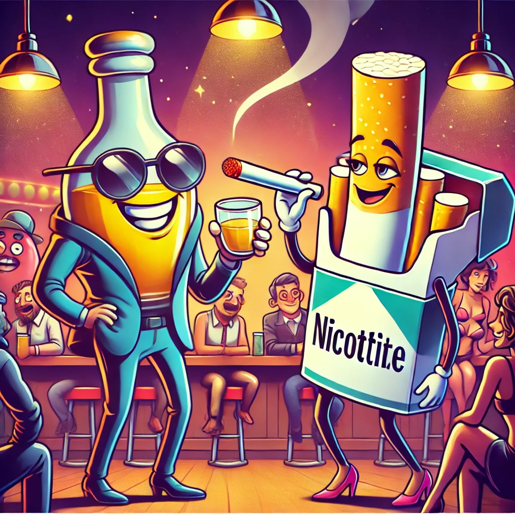 Никотин — более молчаливый персонаж, но не менее хитрый. Он не требует громких тостов, но незаметно подсаживается к тебе, уговаривая выйти «буквально на минутку». Он говорит тихо, но настойчиво: «Давай выйдем на воздух». Вроде бы ничего страшного, но одна сигарета — это как завуалированное рукопожатие с зависимостью.