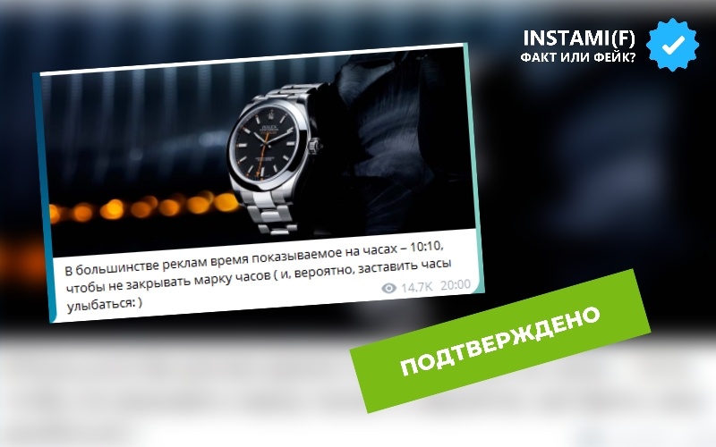 На изображении утверждается, что в большинстве реклам часы показывают время 10:10, чтобы не закрывать марку и создать ассоциацию с улыбкой. ⚠️ Результат проверки ✅ Правда, но с нюансами! 10:10 — стандартное время в рекламе часов. Причины: Не закрывает логотип: Стрелки не заслоняют центральную часть циферблата, где обычно размещён бренд. Эстетика: Симметричное положение стрелок создаёт «улыбку», что подсознательно вызывает позитивные эмоции. Исторический контекст: В прошлом использовали 8:20 (стрелки внизу), но позже перешли на 10:10 как более «оптимистичный» вариант. ⚠️ Заключение ✅ ПРАВДА (10:10 — общепринятый стандарт, но исключения есть). P.S. Теперь, увидев часы на рекламе, вы всегда заметите их «улыбку». А может, это и правда магия маркетинга? ⌚️✨ Факт или фейк? 🤔 Разбираем популярные мифы, странные новости и спорные утверждения, чтобы отделить правду от вымысла. Коротко, ясно и с доказательствами! 📜✅ Подписывайся на наш Дзен и в Telegram-канал и будь в курсе, где правда, а гд