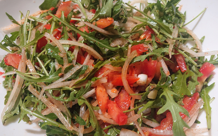✔ Рукола - 50 г; ✔ Помидор (средний) - 1 шт.; ✔ Дайкон - ~120 г; ✔ Лук -1/2 шт.; ✔ Шампиньон - 1 шт (~60 г); ✔ Масло растительное нерафинированное - 1 ч. л.; ✔ Паприка – пара щепоток; ✔ Соус бальзамический на стевии – 1 ч. л.; ✔ Уксус яблочный/рисовый или лимонный сок (буквально капелька)-- по желанию; ✔ Другие специи - по вкусу. Собираем салатик: Руколу отправляю на дно салатника, дайкон нарезаю тоненько в виде «спагетти», помидор - соломкой, лук - как нравится. Шампиньон (шляпку) очистить от кожицы. У меня шляпка чистая и белого цвета. Нарезать на пластинки, затем соломкой (но грибы можно не добавлять, если не любите их). На гриб -капельку уксуса или лимонного сока, перемешать, и отправить к овощам. Присыпать специями, приправить бальзамическим соусом, солю по вкусу и заправляю маслом. КБЖУ на 100 г - 41/1,8/2,1/3,8. + 4 фото Рецепт на странице Автор рецепта – Галина Сасыкова Расчёт КБЖУ сделан с помощью Telegram-чат-бота https://t.me/vesipitaniebot © Почтенный возраст Online и Рецеп