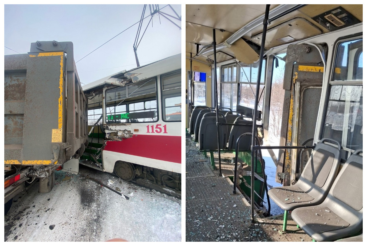 ДТП случилось накануне, 27 февраля, на переезде в районе дома №7 по Сульфидной улице в Магнитогорске. 26-летний водитель тяжелого HOWO не справился с управлением, из-за чего грузовик столкнулся с трамваем. От удара в вагоне появилась дыра, так как кузов большегруза сорвал дверь и частично оказался внутри салона. «По предварительной информации пострадавших в ДТП нет, в момент аварии трамвай следовал без пассажиров», – сообщили в пресс-службе ГАИ Магнитогорска. По данному факту проводится административное расследование. Как сообщал «ЧелябинскСегодня» ранее, в ночь на 27 февраля в Магнитогорске произошла аварии, во время которой пострадали три человека: водитель и двое пассажиров легковушки, врезавшейся в столб.
