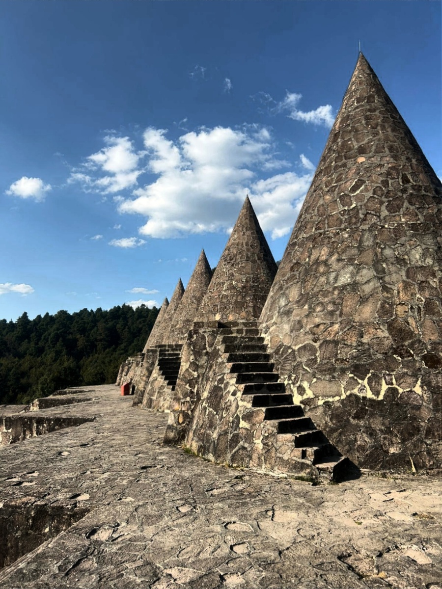 Это было волшебно, теперь это мой любимый коктейль. С чем сравнить не знаю, но очень вкусно, правда я умудрилась часть пролить, когда фотографировалась, было обидно. После такого обеда мы отправились гулять и решили купить мне пончо, тёплое, типа пальто. Гуляя по окрестностям у меня было впечатление как будто я попала в кино вестерн, индейцев не было но лошади были. Потом мы поехали на центр церемониал Отоми. Комплекс для церемонии-жертвоприношений народности Отоми построенный в 1980 году по их просьбе. Это грандиозное сооружение и по высоте и по красоте. Вокруг него кусты подстриженные в форме животных, по краю комплекса стоят столбы-две змеи обвитые вокруг столба и смотрящий друг на друга, даже немного жутковато. Множество ступеней ведут на большую площадь а потом ещё ступени ведущие к фигурам напоминающие конусы, только очень огромные, высотой, наверное метров десять. А в центре статуя напоминающая цветок, но там тоже сплетение змей и выше конусов раза в три. Раньше в конусы и в цветок можно было зайти, судя по присутствию деревянных дверей закрытых на замок.