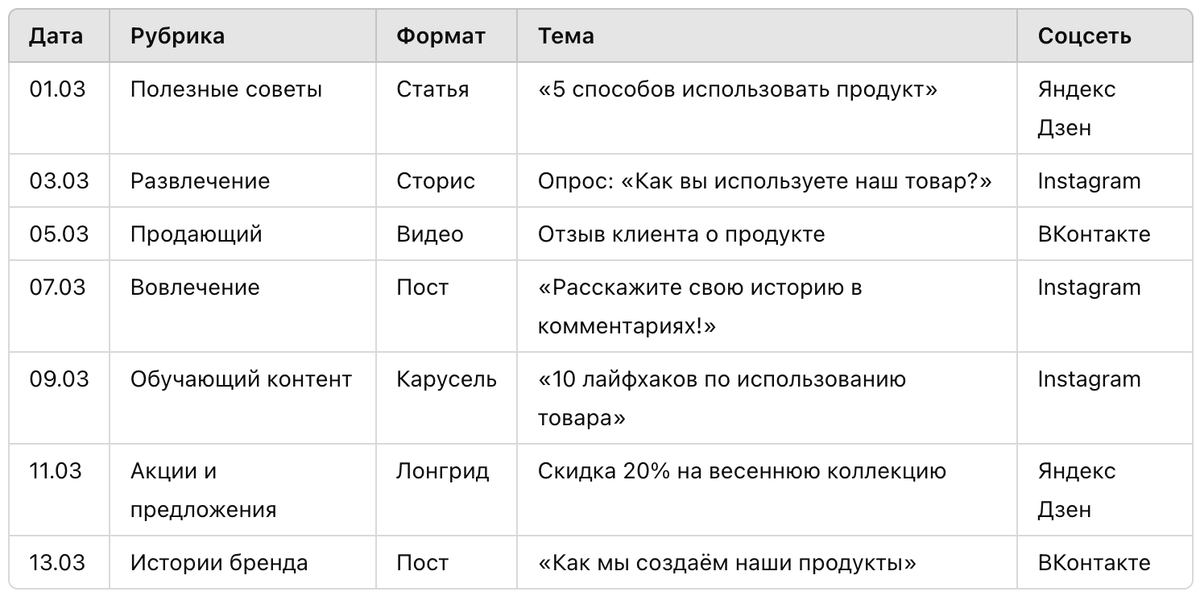 Посмотрите, какие рубрики используют другие бренды или блогеры. Проанализируйте, какие форматы у них вызывают отклик аудитории. - Используйте контент-матрицу: