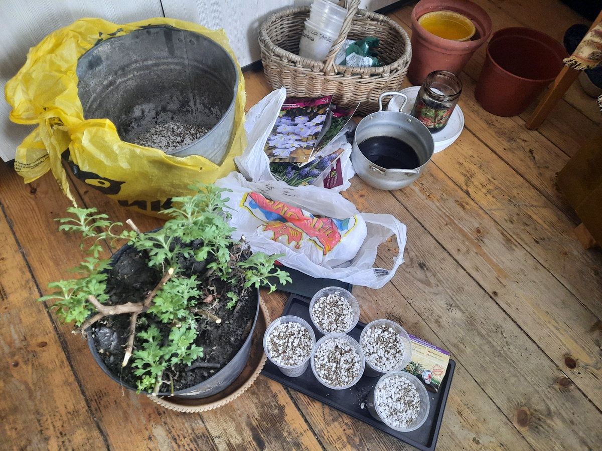 По рекомендации Валерия Марушина решила обеспечить и мелколуковичным весенним, и полузимнезеленым (оказывается, и такие есть! Я и не знала!) холодный старт. Кроме этого пора черенки хризантемы мультифлоры пристраивать на укоренение. Один куст созрел. Притащила сегодня в тележке ведро земляниго микса из города. Муж без машины эти дни приезжал, а он тяжелое не попрет, если не приперло. Ну, я заготовила все, что считала нужным, и приступила к колдовсту. Вот горшок с "черенками". Я его не обламывала, поэтому они весьма привлекательно выглядят по сравнению с другими горшками. Циолит и вемикулит перемешала и насыпала в стаканчики. Без земли! Дырки там есть! Сажа из трубы. Фитоспорин для обработки и полива. Глиокладин откопала. Вспомнила, что корневин-то я и не купила вчера! Забыла! Вот и череночки. Наломала, наотрывала, накопала тех, что побольше выросли. В горшке еще много осталось. На всякий случай! В стаканчики положила по таблетке глиакладина, полила фитоспорином. Выкупанные в к