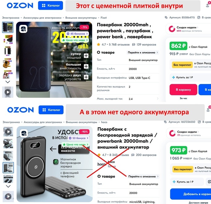 История не новая, но в этот раз «кирпичики» являются лидерами по покупкам. Для начала приведу немного статистики продаж на Ozon пауэрбанков за последние 30 дней. Всего в категории числится 9784 позиции. Из них 1678 нашли хотя бы одного покупателя, а общее количество проданных составило 88255 шт. Если посмотрим на модели емкостью 20000 мА*ч, то обнаружим, что верхние две строчки занимают классические фейки. Их и далее по списку полно, но у «двадцатитысячников» все начинается именно с них. Первому приписали бренд hoco., причем не в названии и описании, а выставив в карточке товара принадлежность к этому бренду. Хитрость, наверное, в том, что владельцы бренда не найдут их поиском и не будут жаловаться. Что касается реальной емкости, то она оказалась вдвое меньше указанной. Приобрели этот фейк 2481 раз. Второй пауэрбанк идет как безымянный, но на фото можно разглядеть марку Fixet. Реальная емкость, судя по инструментальным тестам покупателей, ровно в четыре раза меньше заявленной. Один из