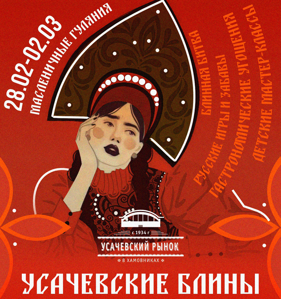 С 28 февраля по 2 марта — на Усачевском рынке отмечают масленицу. Три дня здесь будет проходить гастрономическая ярмарка с большим разнообразием блинов, шашлыков, пирогов и других блюд русской кулинарной традиции. Также гостей ждут фольклорные выступления и мастер-классы, музыкальные концерты и dj-сеты.