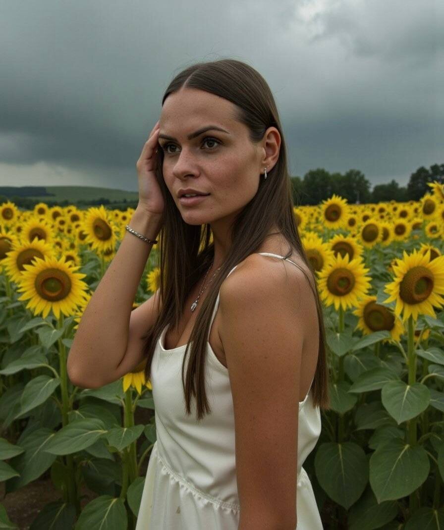 Промт: ### Enhanced Prompt: Brunette Woman Standing in a Sunflower Field Under Heavy Rain Create a cinematic, highly detailed portrait of a brunette woman standing in the middle of a vast sunflower field during a heavy summer rainstorm. The contrast between the warm golden hues of the sunflowers and the cool, refreshing raindrops adds depth, emotion, and a striking visual dynamic to the scene. ### Model and Pose - A brunette woman with long, rain-soaked hair, strands clinging to her face and neck. - Her eyes are open, gazing ahead with depth and emotion, reflecting either serenity, wonder, or quiet confidence. - Raindrops glisten on her skin, highlighting her natural beauty. - Her posture is relaxed yet expressive, capturing the energy of the moment: Standing still, arms slightly raised as if embracing the rain, her palms turned upward. One hand brushing wet hair from her face, adding a sense of natural movement. Holding the petals of a sunflower in her fingertips, lost in thought.