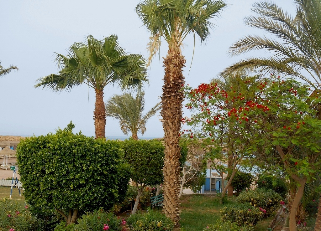 В центре Хургады очень колоритный отель из красного кирпича. В вечерней подсветке он словно иллюстрация сказки «Тысяча и одна ночь». Зубчатые стены, которые по бокам окаймляют башенки, а в нише перед центральным входом разбит сад под пальмами и журчит фонтан, вокруг которого уютные скамьи, похожие на кресла.